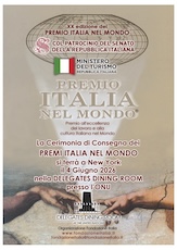 la XX Edizione del PREMIO ITALIA NEL MONDO si terrA' IL 4 GIUGNO a New York nella DELEGATES DINING ROOM - SOUTH DINING ROOM presso le NAZIONI UNITE in omaggio alla universalitA'  della cultura Italiana